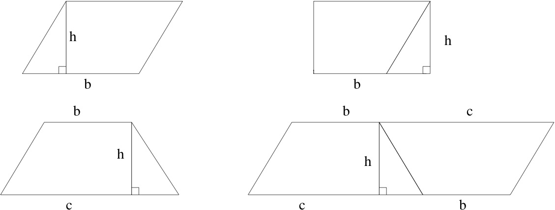 Looking back at the treatment of area in the pre-college math curriculum, you can see the steps toward a mathematical definition. First, for rectangles with integer sides \(a\) and \(b\text{,}\) you can count the number of \(1 \times 1\) squares needed to make the rectangle, leading to the area formula \(A = a \times b\text{.}\) From the physical point of view this is a formula, but from the mathematical point of view it is a definition, extended later to non-integer side lengths. Areas of triangles are not studied until much later. For right triangles with sides \(a\) and \(b\) and hypotenuse \(c\text{,}\) the area is shown to be equal \(ab/2\) by showing that two of these fit together to make an \(a \times b\) rectangle. This invokes a new principle: areas of congruent figures are equal. To compute the area of a parallelogram or trapezoid, the dissection principle is invoked: cutting up and rearranging the pieces of a figure preserves the area. These principles, all of which make intuitive and physical sense, are illustrated in Figure 10.1.