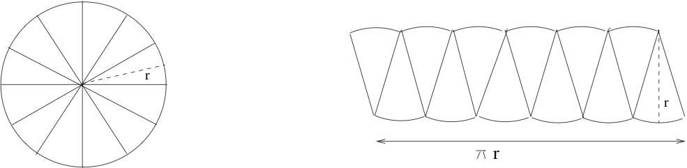 The area of a circle is introduced, usually without much explanation. Do you know why the area of a circle of radius \(r\) is equal to \(\pi r^2\text{?}\) One common explanation is that areas of similar figures are related by a scaling principle. Recalling that area has units of squared length, it makes sense that scaling a figure by \(\lambda\) should scale the area by \(\lambda^2\text{.}\) All circles are similar; if follows that the area of a circle should be \(K r^2\) for some constant \(K\text{.}\) We can name this constant \(\pi\) but that leaves a nagging question unanswered. Scaling also shows that the circumference of a circle should be proportional to the radius, therefore \(C = K' r\) for some other constant \(K'\text{.}\) This turns out to be \(2 \pi\text{.}\) But why should \(K'\) be double \(K\text{?}\) An argument involving dissections and limits is shown in Figure 10.2.