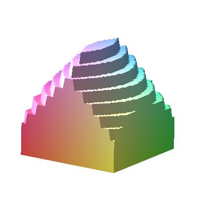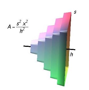 We write an integral for volume of a pyramid whose base is a square of side length \(s\) and whose height is \(h\text{.}\) It corresponds best to the description above if we orient it so the height is measured along the \(x\)-direction with the apex at the origin. See Figure 10.21. The cross-section is a square with side increasing linearly from 0 to \(s\) as \(x\) increases from 0 to \(h\text{.}\) Thus, the side length is given by \(\ell (x) = (s/h) x\text{,}\) hence the cross-sectional area is given by \(f(x) = (s/h)^2 x^2\) between \(x=0\) and \(x=h\text{.}\) The volume is therefore given by \(\displaystyle\int_0^h (s/h)^2 x^2 \, dx\text{.}\) When you learn to compute integrals, this will turn out to be a pretty easy one.