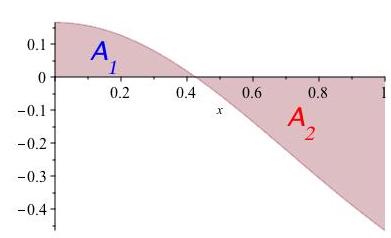 Let \(\Delta_k\) denote the width of \(I_k\text{.}\) The most useful definition turns out to be that the integral is still the limit of sums of the quantities \(\displaystyle\sum_k f(x_k) \cdot \Delta_k\) but we must interpret this as a new concept, called signed area rather than area. We won’t worry too much about signed area; it just means we need to keep track of whether \(f\) is positive or negative before we know whether \(\displaystyle\int_a^b f(x) \, dx\) computes area or its negative. Figure 10.17 shows a function which is positive on \([0,0.42]\) and negative on the interval \([0.42,1]\text{.}\) The integral \(\displaystyle\int_0^1 f(x) \, dx\) will be slightly negative because it adds a positive area \(A_1\) to a negative signed area \(A_2\text{.}\)