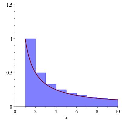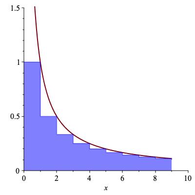 Problem: estimate the \(100^{th}\) harmonic number \(1 + 1/2 + 1/3 + \cdots + 1/100\text{.}\) To solve this, we may as well estimate \(H_n := \displaystyle\sum_{k=1}^n 1/k\) for any positive integer \(n\text{.}\) Summing \(1/n\) looks a lot like integrating \(1/x\text{.}\) In fact, suppose we write a Riemann sum for \(\displaystyle\int_1^n 1/x \, dx\) that has precisely \(n-1\) rectangles. Then the intervals \(I_k\) are just the intervals \([1,2], [2,3], \ldots , [n-1,n]\text{.}\) Even better, we can make areas of the rectangles be exactly the same as in the sum. We just need to use the upper Riemann sum: \(1 + 1/2 + \cdots + 1/(n-1)\text{;}\) see the left-hand side of Figure 10.30 for a picture of this when \(n=9\text{.}\)