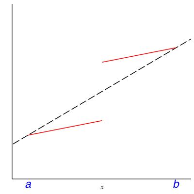 Let \(f\) be a function and \(a < b\) be real numbers. Assuming some hypotheses, there must be a number \(c \in (a,b)\) where the slope of \(f\) is equal to the average slope over \((a,b)\text{,}\) that is,