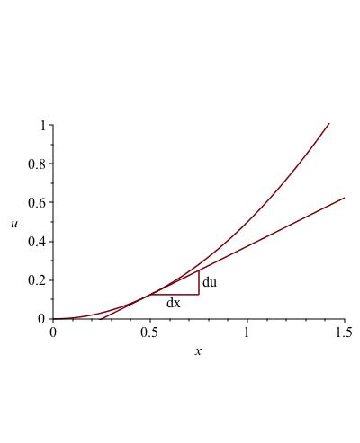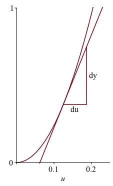 What does this mean quantitatively? The rate of change of \(u\) with respect to \(x\) is \(g'(x)\text{.}\) This is illustrated on the left side of Figure 4.13, where the infinitesimal changes \(dx\) and \(du\) are depicted. The slope of the hypotenuse of the small triangle is \(g'(x)\text{,}\) where in the diagram, the value of \(x\) is roughly \(1/2\text{.}\) On the right side of the figure, we see that this small change in \(u\) leads to a proportionate small change in \(y\text{.}\) The ratio, \(dy/du\) is equal to \(f'(u)\text{.}\) One question remains: at what value of \(u\) is this ratio evaluated? In the figure, it appears \(u \approx 1/8\text{.}\) More precisely, if we originally took \(x\) to be \(1/2\text{,}\) the \(u\) value will be \(f(1/2)\text{.}\) In other words, the value from the \(u\)-axis (vertical in the first graph) is copied to the second graph (where the \(u\)-axis is now the horizontal axis). In other words, \(f'\) is evaluated at \(u\text{,}\) which is \(g(x)\text{.}\) Thus \(dy/dx = du/dx \cdot dy/du |_{u = g(x)}\text{.}\)