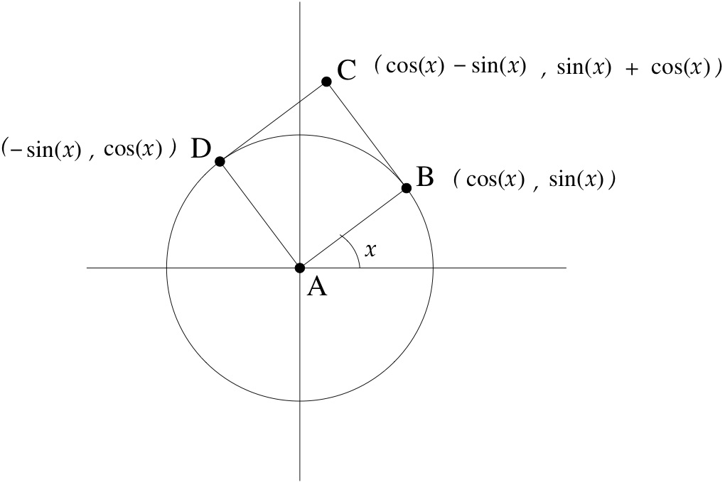 Suppose a toy car is moving around a circular track of radius one meter, so that its speed is constant 1 meter per second; the coordinates of the point are \(x = \cos t, y = \sin t\text{.}\) By definition of radian, its angle with respect to the horizontal increases at a rate of one radian per second. The northward (\(y\)-direction) speed is the derivative of \(\sin t\text{.}\) Suppose at time \(x\) a gate opens up and the car stops turning to stay on the track and coasts straight onward at its present speed of 1. Its northward speed during the time \([x,x+1]\) is the derivative of the sine function at time \(x\text{.}\) To evaluate this, we just have to check how far northward the car went from time \(x\) to \(x+1\text{.}\) This is just analytic geometry. The car goes one unit tangent to the circle during this time interval from the point \((\cos x , \sin x)\) (B in Figure 4.11) to the point \((\cos t - \sin t, \sin t + \cos t)\) (A in the figure). Therefore the derivative of \(\sin\) is \(\cos\text{.}\) For free, we also get (by looking at the \(x\) coordinate) that the derivative of \(\cos\) is \(-\sin\text{.}\)