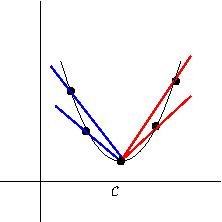 Here is a more airtight argument. Because \(f\) is differentiable at \(c\text{,}\) the one-sided derivatives exist and are equal. The derivative from the right is \(\lim_{x \to c^+} \frac{f(x) - f(c)}{x-c}\text{;}\) because \(c\) is a minimum, both top and bottom of this fraction are positive (the numerator could be zero). The limit of nonnegative numbers is nonnegative, hence \(f'(c_+) \geq 0\text{;}\) see Figure 7.6. Similarly, \(f'(c_-)\) is a limit in which each term is nonpositive, thus \(f' (c_-) \leq 0\text{.}\) For these to be equal, both must equal zero. This finishes the proof.