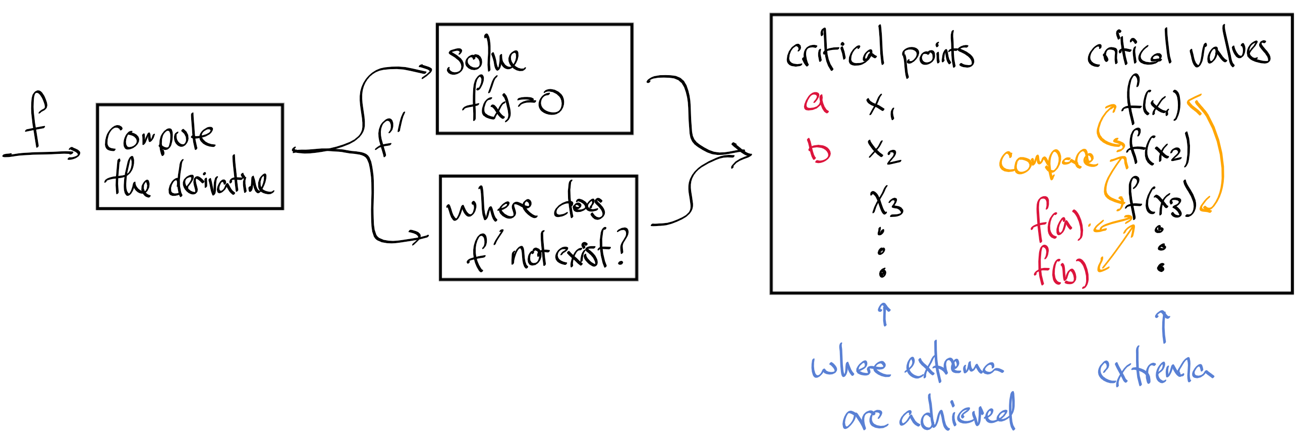 Suppose \(f\) is continuous on \([a,b]\) and differentiable everywhere on \((a,b)\) except for a finite number of points \(c_1, \ldots, c_k\text{.}\) Then the minimum value of \(f\) on \([a,b]\) occurs at one or more of the points \(\{ a, b, c_1, \ldots , c_k , \mbox{ anywhere } f' = 0 \}\text{,}\) and nowhere else. The maximum also occurs at one or more of these points and nowhere else.