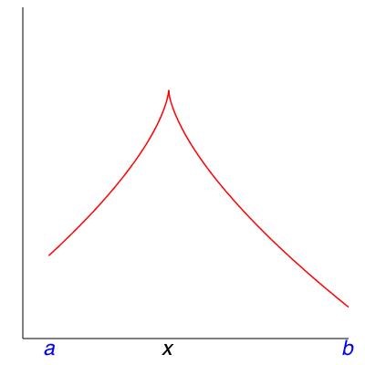 Being differentiable except for a number of points (call them \(c_0,\ldots,c_k\)) is sometimes called being piecewise differentiable, because the function is differentiable in pieces, the pieces being the intervals \((c_0, c_1) , (c_2, c_2), \ldots , (c_{k-1} , c_k)\text{.}\)