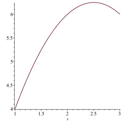 Find the maximum of \(f(x) := 5x - x^2\) on the interval \([1,3]\text{;}\) see the figure at the right. Computing \(f'(x) = 5-2x\) and setting it equal to zero we see that \(f'(x) = 0\) precisely when \(x = 2.5\text{.}\) There are no points where \(f'\) is undefined, so our list consists of just the one point plus the two endpoints: \(\{ 1, 2.5, 3 \}\text{.}\) Checking the values of \(f\) there produces \(4, 6.25, 6\text{.}\) The maximum is the greatest of these, occurring at \(x = 2.5\text{.}\)