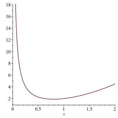 What are the extrema of the function \(f(x) := x^2 + 1/x\) on the interval \((0,2)\text{?}\) The only critical point is where \(f'(x) = 2x - 1/x^2 = 0\text{,}\) hence \(x = \sqrt[3]{1/2}\text{.}\) Here, \(f''(x) = 2 + 2/x^3 > 0\) therefore this is a local minimum. There are not any local maxima. This means \(f\) has no global maximum on \((0,2)\text{.}\) It may have a global minimum, and indeed, Figure 7.18 shows that \(x = \sqrt[3]{2}\) is a local minimum. In your homework you will get some more tools for arguing whether a local extremum on a non-closed interval is a global extremum.
