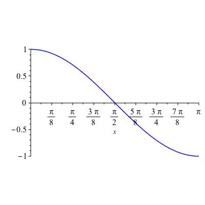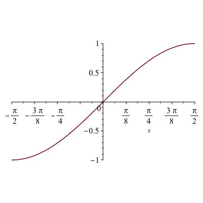 There is a standard way that the domain is restricted on trig functions so that the inverse function can be defined. For \(\sin \) and \(\tan \) it is \([-\pi/2 , \pi/2] \text{.}\) The function \(\cos \) when restricted to \([-\pi/2,\pi/2] \) is not one-to-one; the standard choice for \(\cos \) is \([0,\pi] \text{.}\) These are arbitrary conventions, but are probably built in to your calculator, so we had better adopt them. Also, along with \(\sin^{-1} \text{,}\) \(\cos^{-1} \) and \(\tan^{-1} \text{,}\) the conventional names \(\arcsin, \arccos \) and \(\arctan \) are also used.
