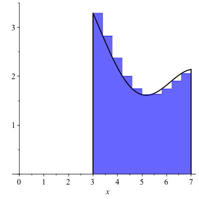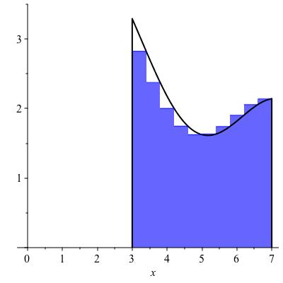 The values of the lower and upper Riemann sums in Figure 10.4 are approximately \(6.9\) and \(9.8\text{.}\) These are not very close to each other, leaving considerable uncertainty about the true area. Replacing by the left (say) Riemann sums, we can program the sum into a computing device and compute for much greater values of \(n\text{.}\) If we increase \(n\) from 3 to 10, as in Figure 10.7, we find the Riemann sums come out to approximately 8.48 and 8.02 -- somewhat better. These are not necessarily bounds: the true value could be greater than both, or less than both, or in between. Replacing \(n\) by 50 gives 8.28. This is again not a bound, however the following theorem guarantees that as \(n \to \infty\text{,}\) this will converge to the area.