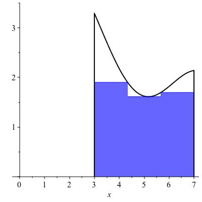 = (4/3) 5.2 \approx 6.93\text{.}\) The upper Rieman sum is computed from rectangles with approximate heights \(3.3, 1.9\) and \(2.15\text{,}\) leading to a total area of \((4/3) 7.35 = 9.8\text{.}\)