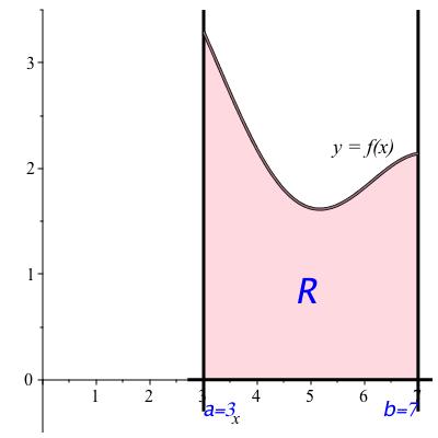 With this build up, we will give a mathematical definition for the area for a certain restricted class of shapes. These are rectangular on three sides but whose top is described by a continuous function. More precisely, let \(a \lt b\) be real numbers and let \(f\) be positive and continuous on the closed interval \([a,b]\text{.}\) We will define the area of the region \(R\) bounded on the left by the vertical line \(x=a\text{,}\) on the right by the vertical line \(x=b\text{,}\) on the bottom by the \(x\)-axis (the line \(y=0\)), and on the top by the graph of \(f\) (the curve \(y = f(x)\)). This region is shown in Figure 10.3.
