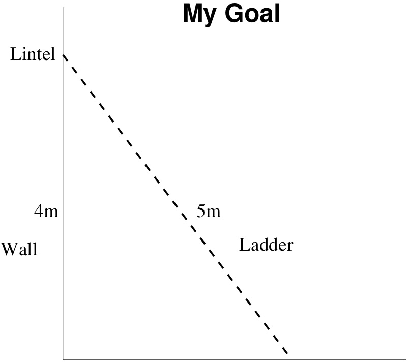 I am hanging wind chimes on my balcony using a ladder 5 meters long. On the highest safe step, my shoulders will be exactly at the top of the ladder, which I need to be at the height of the balcony rail, 4 meters above the ground. Every time I reposition the ladder I scratch the paint, so I’d rather not move it too many times. I need to get my shoulders within a couple of centimeters of the right height in order to drive a nail into the lintel. Where should I put the base of the ladder? The Pythagorean theorem tells me the it should be 3 meters from the wall; see Figure 1.2