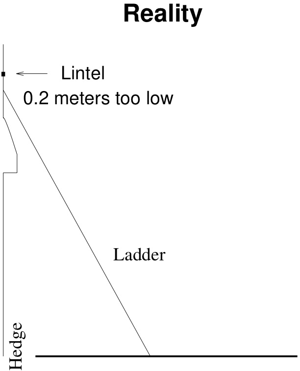 The height I am trying to reach is shown in Figure 1.3. which has \(x=3\) and \(h(x) = 4\text{.}\) Instead I hit some other point \(z\) with \(h(z) = 3.8\text{.}\) Clearly \(z\) is too far from the wall. How far do I need to scoot the ladder toward the wall? As you can see in Figure 1.3, due to the balcony and the hedge, it was not feasible to measure either the height of the lintel or the distance I placed the foot of the ladder more accurately.