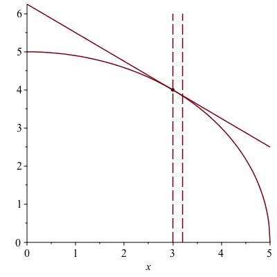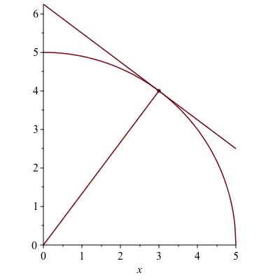 What is the slope of this line? The graph is a quarter-circle. Recall from geometry that any tangent to a circle makes a right angle with the radius. The slope of the radius from \((0,0)\) to \((3,4)\) is \(s = 4/3\text{.}\) The slope of any line making a right angle with this is the negative reciprocal \(-1/s = - 3/4\text{.}\) In other words, the slope of the tangent line is \(-3/4\text{.}\)