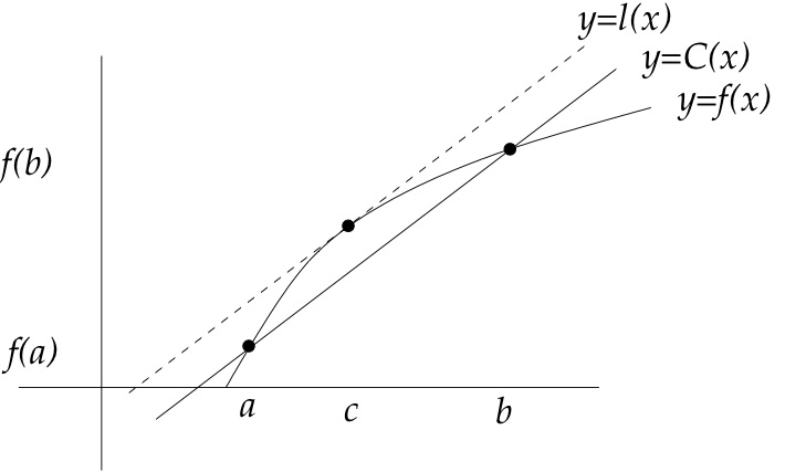 Figure 3.8 shows a function \(f(x)\) which is concave down. As long as \(x\) is in the interval \([a,b]\text{,}\) we are guaranteed to have \(C(x) \leq f(x)\text{.}\) On the other hand, when \(f'' \lt 0\) on an interval, the function always lies below the tangent line. Therefore \(L(x)\) is an upper bound for \(f(x)\) when \(x \in [a,b]\) no matter which point \(c \in [a,b]\) at which we choose to take the linear approximation.